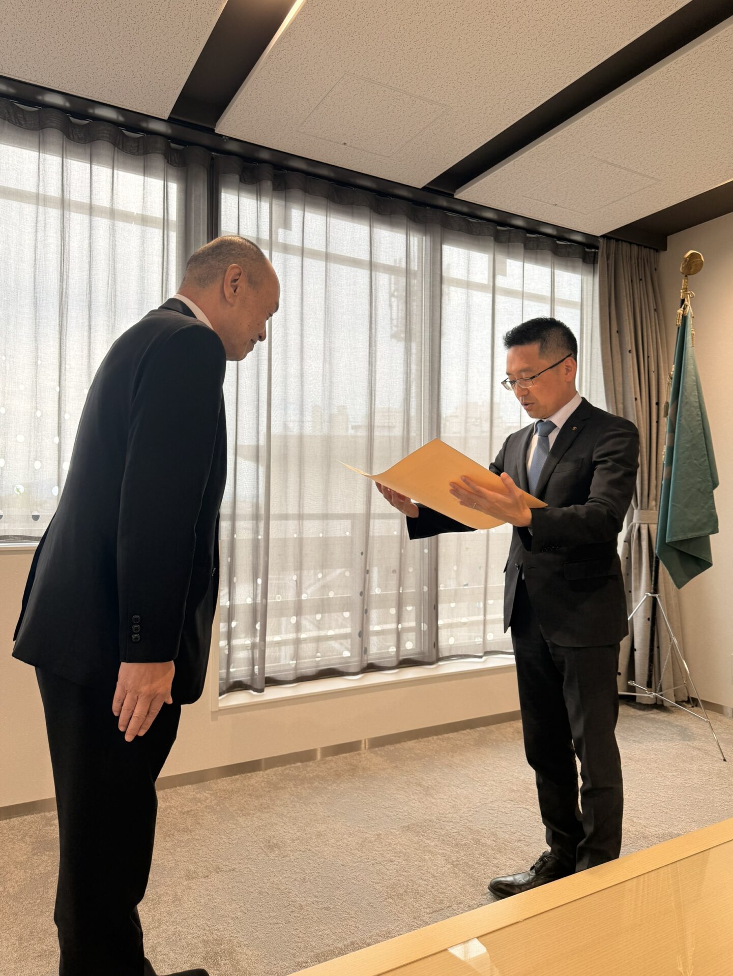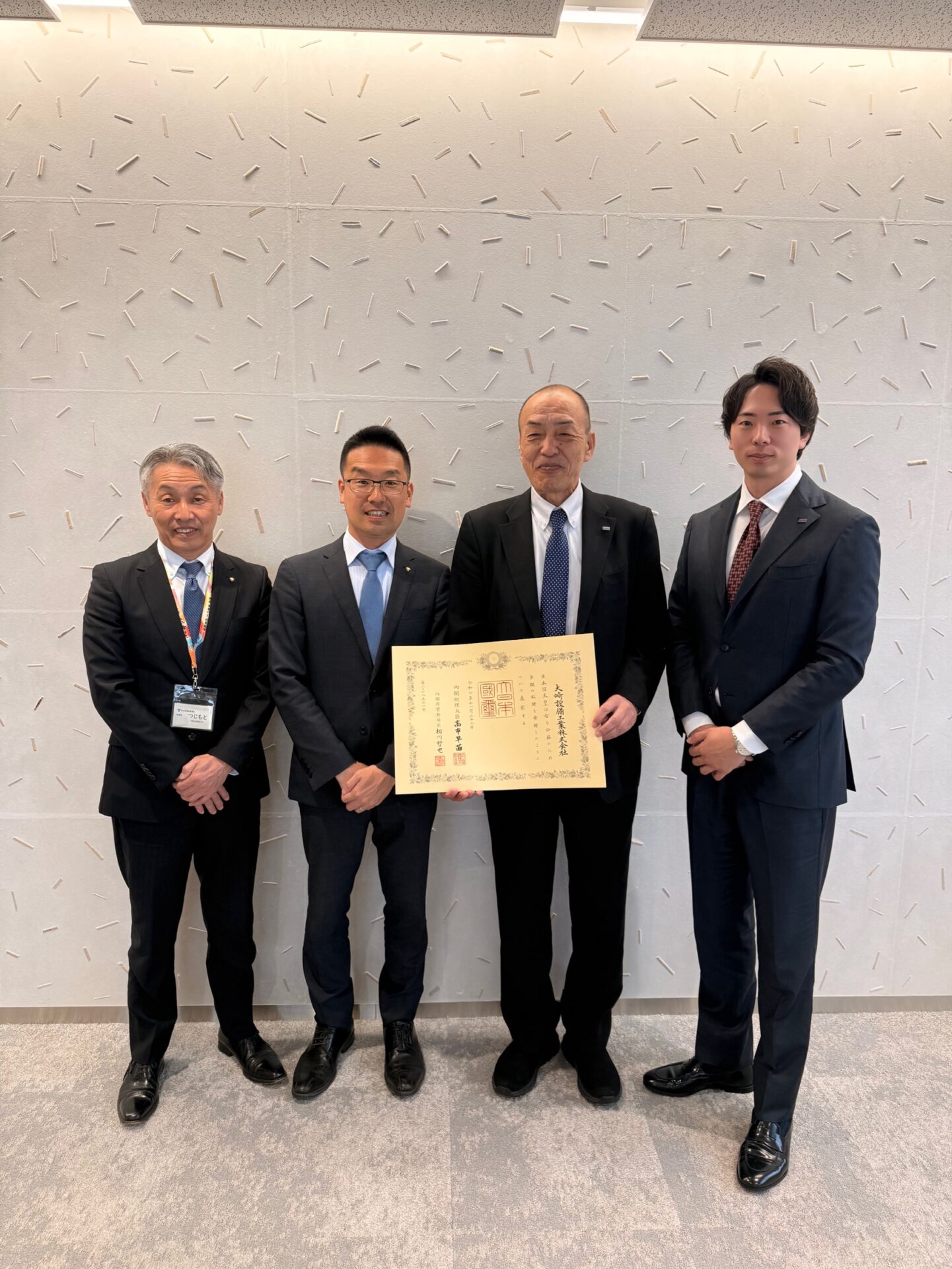 令和8年4月22日、守山市役所において、紺綬褒章受章に伴う褒章の記の贈呈式が執り行われ、当社を代表して代表取締役 大崎裕士および常務取締役 大崎恭平が出席し、守山市長より褒章の記を拝受いたしました。